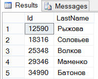 В этом примере сначала объявляется табличная переменная @deleteTable с двумя столбцами: Id и LastName. В этой таблице будут сохранены удаленные строки. Синтаксис инструкции DELETE расширен предложением OUTPUT: “OUTPUT deleted.Id, deleted.LastName INTO @deleteTable”. Посредством этого предложения система сохраняет удаленные строки в таблице deleted, содержимое которой потом копируется в переменную @deleteTable.