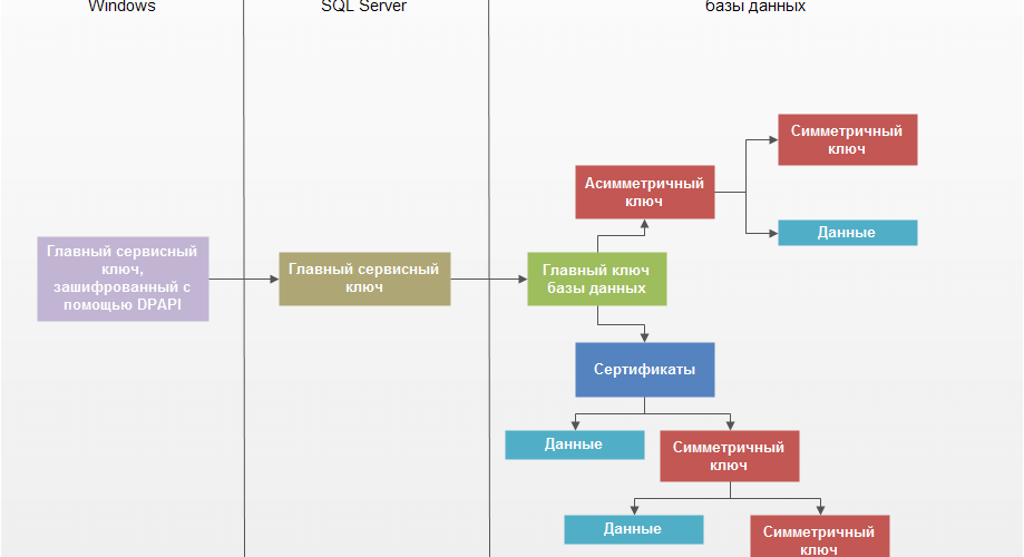 На рисунке выше главный сервисный ключ задает ключ, который управляет всеми другими ключами и сертификатами. Главный сервисный ключ создается автоматически при установке компонента Database Engine. Этот ключ зашифрован с помощью API-интерфейса защиты данных Windows (DPAPI – Data Protection API).