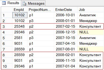 Запрос в этом примере выбирает из таблицы Works_on строки, удовлетворяющие условию Job=’Консультант’. Представление view_Consultant определяется строками и столбцами, возвращаемыми этим запросом. На рисунке ниже отображена таблица Works_on, в которой строки, выбранные в представлении view_Consultant, выделены красным цветом: