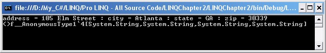 Если бы вместо использования именованного класса Address возникло желание применить анонимный тип, нужно было бы просто опустить имя класса. Однако тогда не получится сохранить вновь созданный объект в переменной типа Address, потому что он уже не будет переменной типа Address. В таком случае он относился бы к сгенерированному типу, который известен только компилятору. Поэтому пришлось бы изменить также и тип переменной address. Здесь снова на помощь приходит ключевое слово var: