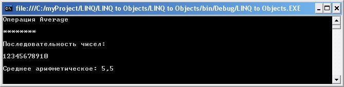Операция Average возвращает среднее арифметическое числовых значений элементов входной последовательности. Эта операция имеет два прототипа, описанные ниже: