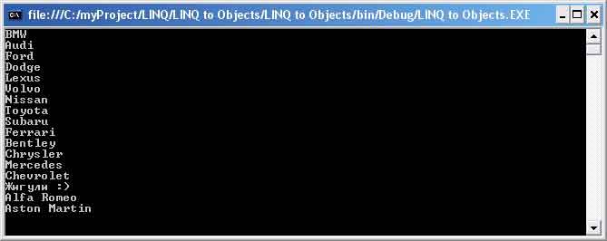 Перед вызовом операции OrderBy создается экземпляр компаратора. Его экземпляр можно было бы создать в самом вызове метода OrderBy, но тогда не получилось бы ссылаться на него в цикле foreach. Ниже показаны результаты запуска примера: