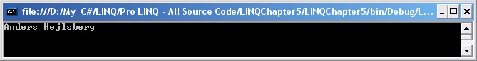 В данном примере вместо ожидания получения последовательности от запроса мне нужна просто ссылка на определенного сотрудника. Операция Single очень полезна в такой ситуации — до тех пор, пока вы можете гарантировать, что в переданной ему последовательности есть только один элемент. В данном случае, поскольку я вызвал операцию Where, указав уникальный ключ, я в безопасности. И вот результат: