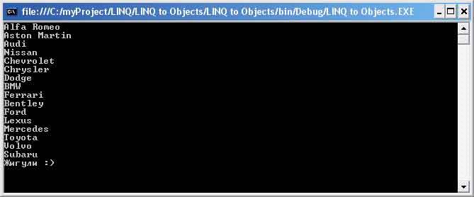 "Ferrari", "Bentley", "Ford", "Lexus", "Mercedes", "Toyota", "Volvo", "Subaru", "Жигули :)"};