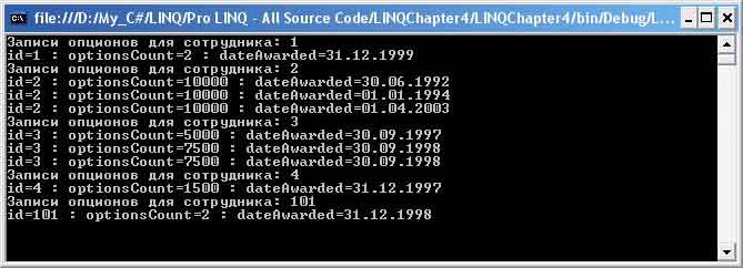 Для примера применения третьего прототипа GroupBy предположим, что нас интересуют даты назначения опционов для каждого сотрудника. Этот код будет очень похож на код примера первого прототипа. Итак, ниже вместо возврата последовательности сгруппированных объектов EmployeeOptionEntry будут группироваться даты: