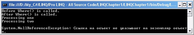 Как видите, вызов операции Where прошел без исключения. Оно не появилось до тех пор, пока при перечислении не была произведена попытка обратиться к третьему элементу последовательности. Теперь представьте, что последовательность ieStrings передана функции, которая дальше выполняет перечисление последовательности — возможно, чтобы наполнить раскрывающийся список или какой-то другой элемент управления. Легко подумать, что исключение вызвано сбоем в этой функции, а не самим запросом LINQ.