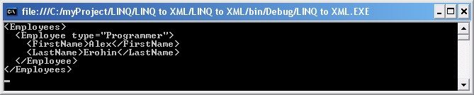 В приведенном коде видно, что базовый код дополнен кодом добавления элемента Employee к элементу документа Employees. Здесь с помощью метода Element документа получается элемент Employees, после чего с использованием метода Add к списку его дочерних элементов добавляется новый элемент. Ниже показан результат: