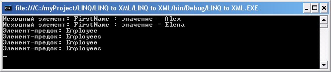 В этом виде пример не столь выразителен, как мог бы быть, поскольку код расширен в демонстрационных целях. Например, нужно было захватить последовательной элементов FirstName, чтобы отобразить их наглядно в выводе. То есть оператор, содержащий вызов метода Descendants, и последующий блок foreach предназначены для этой цели. Затем во втором цикле foreach вызывается операция Ancestors и отображается каждый элемент-предок. В действительности, во втором цикле foreach можно было бы вызвать на каждом элементе последовательности элементов FirstName метод Ancestors, не прибегая к операции Ancestors.