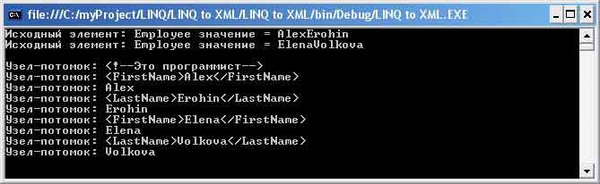 В выводе присутствуют не только сами элементы Employee и их потомки, но также один узел, не являющийся элементом — комментарий. В этом состоит отличие между операциями DescendantNodesAndSelf и описанной в следующей статье Descendants, которая пропускает узлы, не являющиеся элементами.