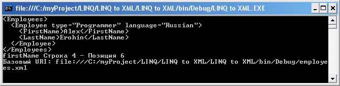Этот код загружает файл XML, созданный в предыдущей статье. После загрузки и отображения документа получается ссылка на элемент FirstName и отображается строка и позиция этого элемента в исходном XML-документе. Затем отображается базовый URI элемента. Вот результат: