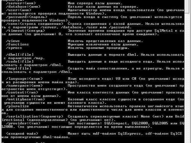 Обратите внимание, что опции /dbml, /code и /map могут быть указаны без предоставления имени файла. Если имя файла не задано, то сгенерированный код XML выводится на консоль.
