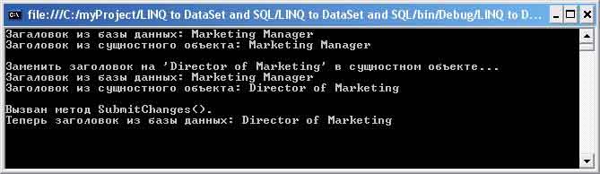 Этот код много чего делает, но его цель — доказать, что изменения, проведенные в сущностном объекте, не сохраняются в базе данных до тех пор, пока не будет вызван метод SubmitChanges. Когда вы видите вызов метода GetStringFromDb, это значит, что он извлекает ContactTitle непосредственно из базы данных с использованием ADO.NET. Ниже показаны результаты выполнения кода: