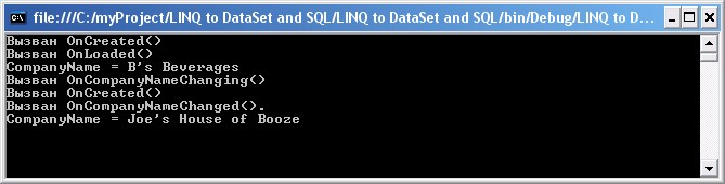 В приведенном коде нет ничего особенного, за исключением реализации ряда частичных методов, поддерживаемых сущностными классами. Сначала запрашивается контакт и на консоль выводится название его компании. Затем название компании изменяется и снова выводится на консоль. Давайте посмотрим на вывод этого кода: